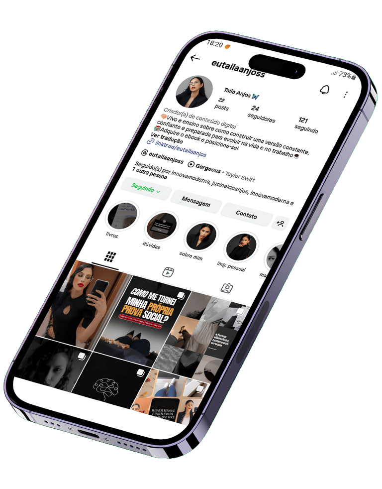 Meu nome é Taila Anjos, sou criadora de conteúdo digital e infoproduto, compartilho sobre desenvolvimento pessoal e profissional.